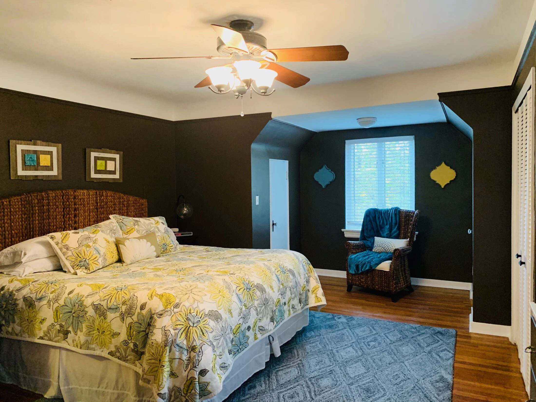 There are four bedrooms including a large master bedroom, with more closets than you usually expect in a 1920s home. The master has an en suite bath, updated by previous owners with glass tile accents and what looks like handmade floor tiles in soft blues and greens.
